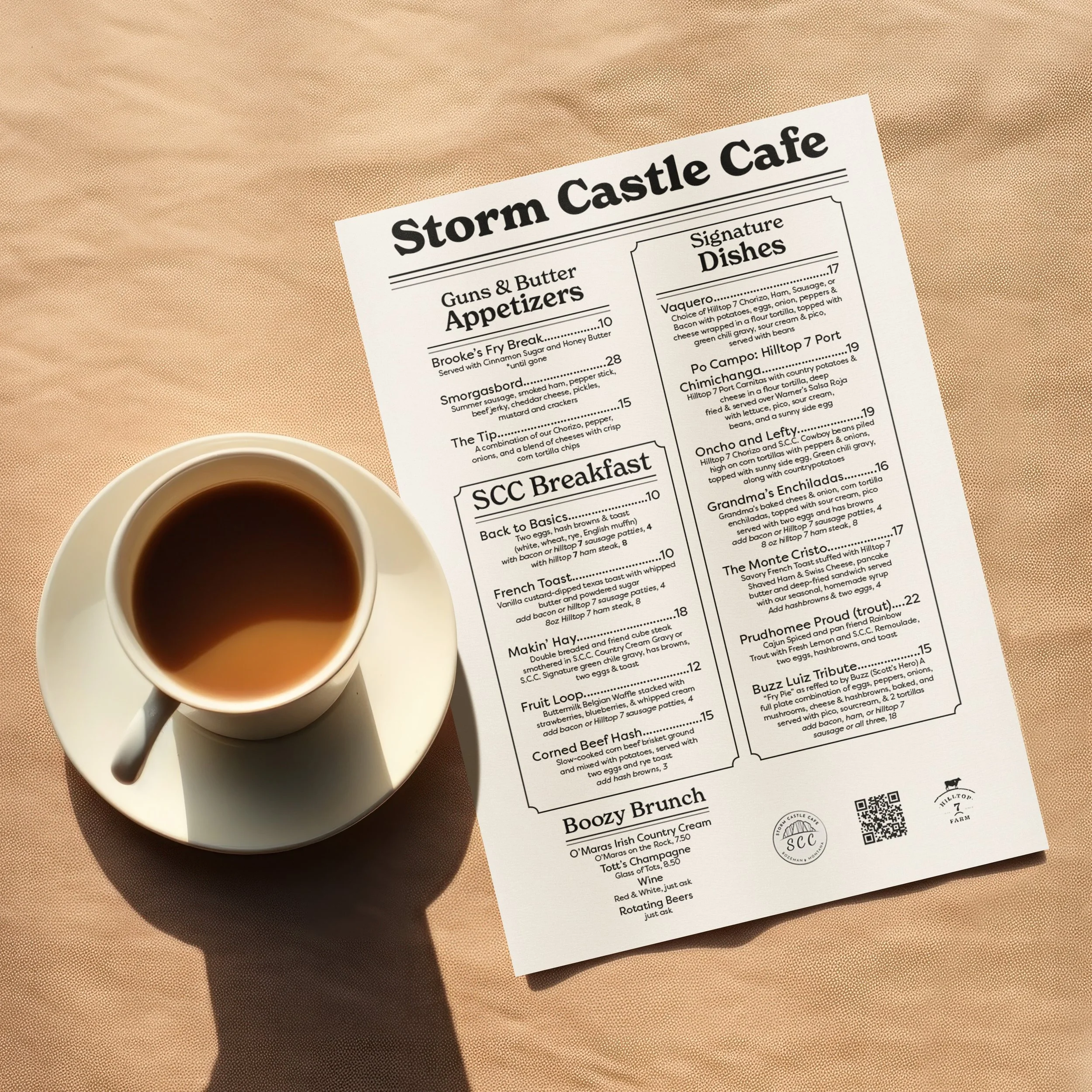 This project was intended to rejuvenate and refresh the menu of Storm Castle Cafe. A minimalistic yet suiting menu was created to help with the refresh of the cafe. The menu features a friendly, yet bold font to batch the vibe of the cafe, whereas the furniture included is to guide the patron to the most important elements of the menu itself. These elements combined create a striking and pleasant menu that not only catches the eye of the patron but also fits the feel and vibe of the cafe.